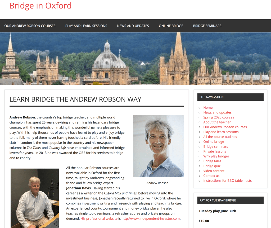 Bridge, the greatest card game ever invented, has been a central part of my life for as long as I can remember. After years of studying and playing the game at a high level, in 2018 I started to teach and coach players in and around my home town of Oxford as a professional sideline, using the methods of my friend Andrew Robson, bridge correspondent of The Times. The results have vastly exceeded my expectations. You can find out more visiting my dedicated bridge website Bridge In Oxford.